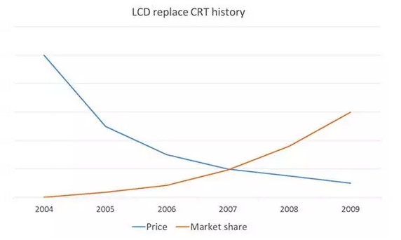 由技術(shù)更新?lián)Q代所引發(fā)的替代革命往往超出人們的想像.回顧電視機市場的發(fā)展歷程,在短短的5年內(nèi),液晶電視在全球范圍內(nèi)全面替代了CRT電視。