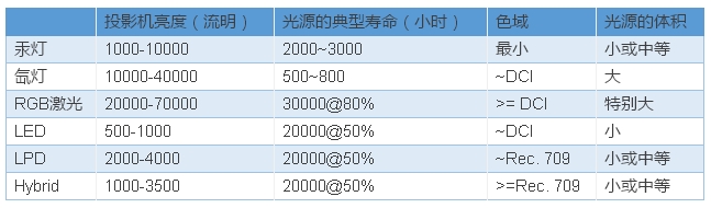 而隨著國內(nèi)市場對于高亮度工程投影機的需求不斷攀升,如今的工程投影機市場在顯示技術(shù)方面也有了新的變化。從最傳統(tǒng)的燈泡投影到LED投影機、激光投影,各種不同的投影技術(shù)都試圖在巨大的市場中找到一席之地。下面的表格從技術(shù)角度對不同的投影技術(shù)做了橫向的對比分析。