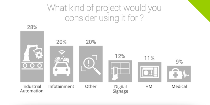 近50%的受訪者認為,嵌入式Android系統主要適用于工業自動化和車載娛樂系統中。 而數字標牌、人機互動和醫療也被認為是嵌入式Android系統的重要應用方向。