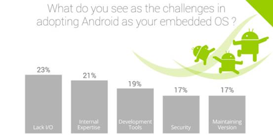 受訪者認為適應觸屏界面、縮短上市時間和產品易于客制化是嵌入式Android的主要優勢。觸屏界面為嵌入式控制臺應用等操作提供了便利,也為企業向工業4.0的轉型提供了基礎。同時,開源的Android系統大大方便了開發者對系統進行客制化調整和升級,縮短上市時間。