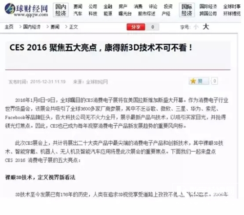 CES 2016是一個世界級頂尖創新和展示舞臺,對于意欲將裸眼3D技術推向全球的康得新來說,這無疑是極好的機遇。在用戶對于3D剛性需求基礎上,在行業的共同努力下,康得新正在乘勢而上,以“中國制造”走出國門,走向世界創新平臺,引領全球3D發展新格局。