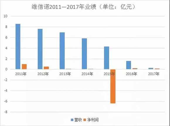 筆者對(duì)比了近幾年來維信諾的年度業(yè)績:2011年—2017年全年?duì)I收分別為8.57億元,7.62億元,6.97億元,5.83億元,4.30億元,1.59億元,0.31億元,歸屬于上市公司的凈利潤分別為1.02億元,0.55億元,0.14億元,0.12億元,-6.41億元,0.26億元、0.15億元。
