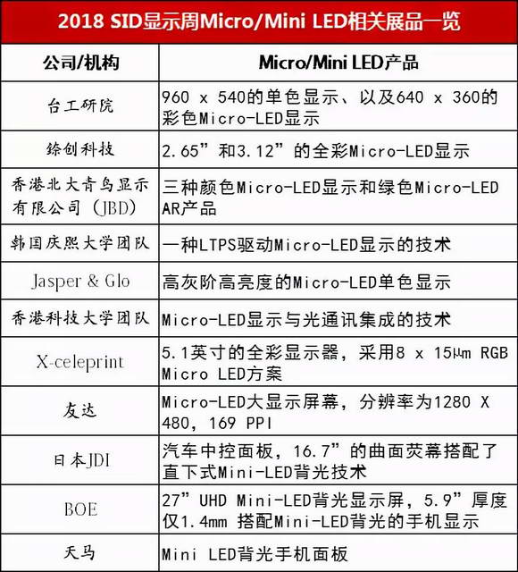 在2018 SID顯示周上,臺工研院、錼創科技、香港北大青鳥顯示有限公司(JBD)、韓國慶熙大學團隊、Jasper & Glo、香港科技大學團隊、X-celeprint、友達、日本JDI、BOE、天馬紛紛展示了Mini LED 和Micro-LED的最新產品。