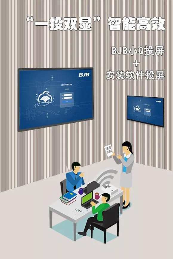 對于Windows版本設備使用Q-Share,可實現“一投雙顯”,即筆記本通過插入小Q可以將內容投屏到一塊屏幕,再通過安裝投屏軟件利用本身無線網卡將屏幕內容投屏到另一塊屏幕。如果您的會議室面積較大且與會人數眾多時,這個功能可以助您一臂之力。