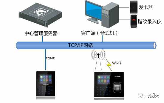 考勤系統主要由三部分組成:前端設備、傳輸網絡和管理中心。系統架構如下圖所示: