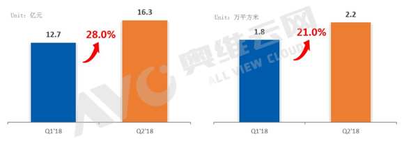 2018年H1中國小間距LED國內市場銷售額和銷售面積及其環比
