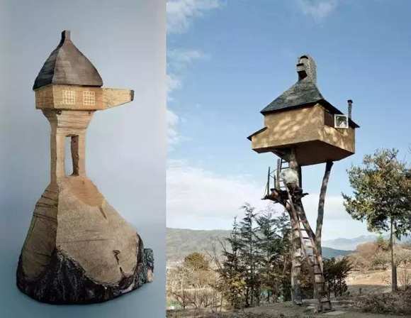 圖中的樹上茶室,是被稱為日本建筑界“老頑童”藤森照信(也是本次展覽的策展人)為自己修建的樹上茶室“高過庵”,被美國(guó)時(shí)代周刊評(píng)選為“世界上10大最危險(xiǎn)的建筑”。不過現(xiàn)在,觀眾不需要冒險(xiǎn),就可以假裝在里面喝茶了。
