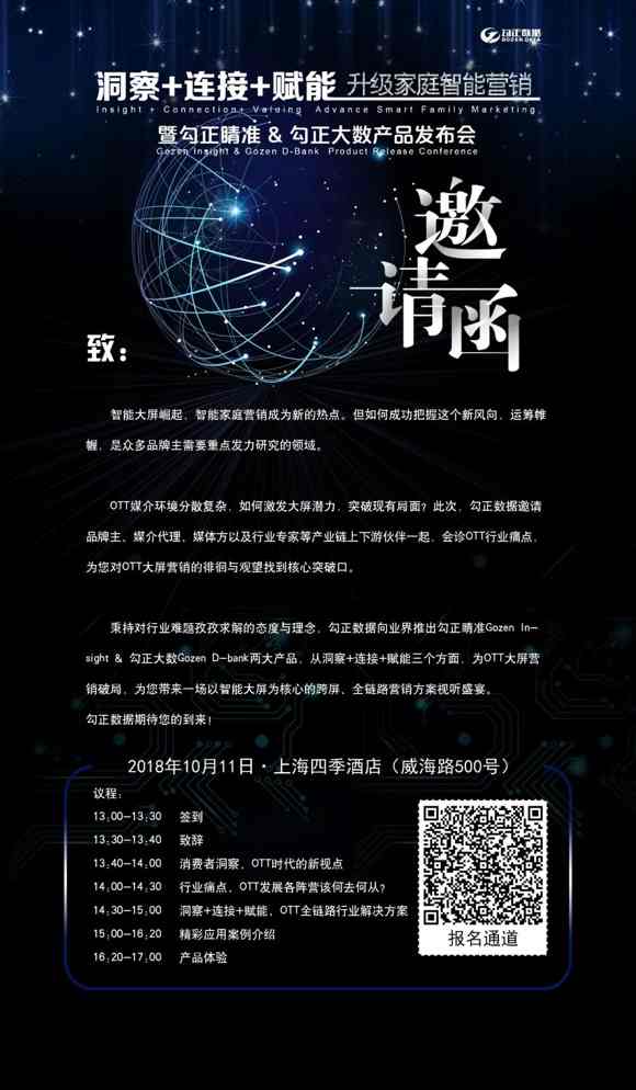 其中,勾正睛準&勾正大數將于10月11日上海四季酒店正式發布,CSM、尼爾森、陽獅、群邑、京東黑瓏、老板電器等眾多知名企業將蒞臨本次會議,歡迎行業伙伴報名參加。