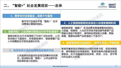 《報告》認為,未來我國“智能+”社會發展水平將快速提升,有三個方面值得關注:一是智能生活消費將領銜“智能+”社會發展,以智能人機交互、智能服務推送等形式,實現城鄉居民在購物休閑、家居生活、交通出行等領域的快速響應、個性定制和按需服務;二是智能公共治理將提升“智能+”社會基準線,實現跨層級、跨地域、跨系統、跨部門、跨業務的公共治理協同,形成全程在線、高效便捷、精準監測、高效處置、主動發現、智能處置的智能管理體系;三是智能生產將是“智能+”社會的主陣地,基于平臺的生產方式向全行業演進,生產體系邁向組織重構、動力變革、模式創新的新階段。