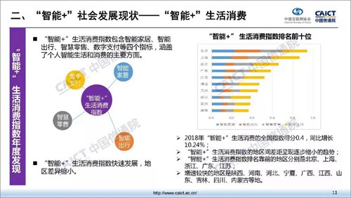 《報告》包括“智能+”生活消費、“智能+”公共治理、“智能+”生產供給三大部分。在“智能+”生活指數方面,中西部地區快速發展,地區差異縮小;數字支付全面普及,發展水平最高;人工智能賦能智能家居進入快速發展新階段;智能導航廣泛應用推動智能出行水平快速提升;智慧零售網點迅猛增長,電商零售進入平穩發展期。