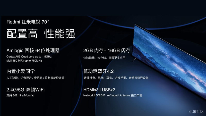 Redmi紅米電視采用Amlogic 四核 64位高性能處理器,2GB+16GB大儲存,體驗更流暢;2.4G/5G 雙頻WiFi聯網不卡頓;應用低功耗藍牙4.2連接藍牙設備更穩定!豐富接口,滿足多種娛樂需求,輕松連接電腦、連接游戲主機、連接外接音響設備。