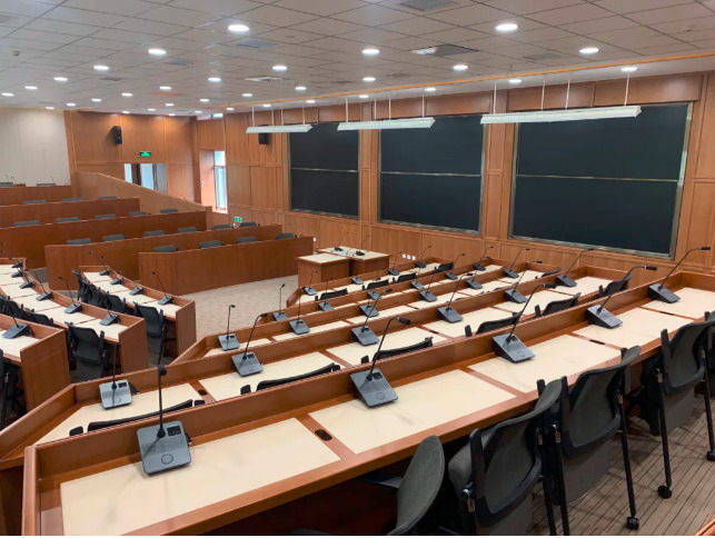 針對培訓室主要用于交流會議、培訓等使用形式,鐵三角在話筒系統(tǒng)設(shè)計上,將培訓室房間面積500平,劃分為3個區(qū)域,每個區(qū)域共放有32套有線單元。其中兩個50INT同聲傳譯單元在單獨房間做翻譯用,培訓室內(nèi)共98套有線單元,針對每個區(qū)域的32套有線話筒用兩條專用網(wǎng)線形成一個環(huán)路各接一臺會議主機。