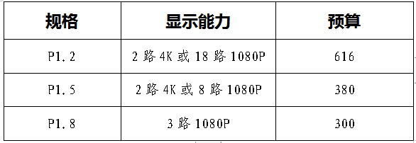 規格 顯示能力 預算 P1.2 2路4K或18路1080P 616 P1.5 2路4K或8路1080P 380 P1.8 3路1080P 300