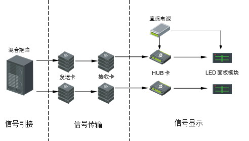 綜合以上各因素,結合廠家LED大屏模組規格,確定大屏寬度為12.10m±0.1m,高度為3.41m±0.1m。 (三)確定顯示系統架構