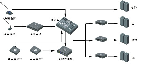 該會議廳一般用于召開會議、演訓導演、觀看錄像、演講授課等活動,采用2.1聲道系統即可滿足需求,同時為確保重大演訓活動時的會議保障安全,需采用主備在線設計。