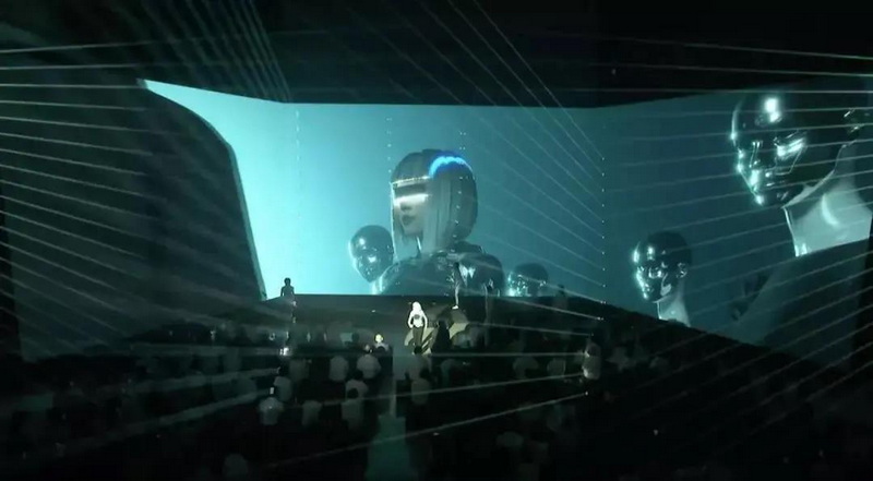 由屏幕組成的服裝,四聯(lián)同步:音樂、視頻、舞蹈、服裝形成一個整體效果,一場精彩未來感十足的視聽盛宴。