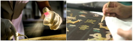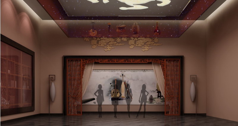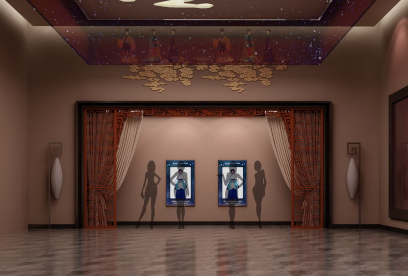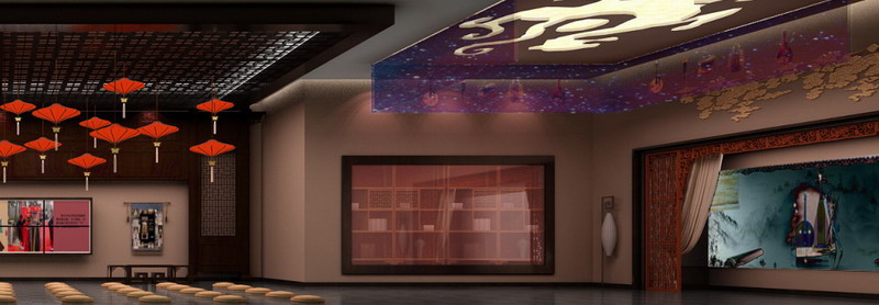 以暗紅色的墻面拓印著金色燙金的漢代圖案