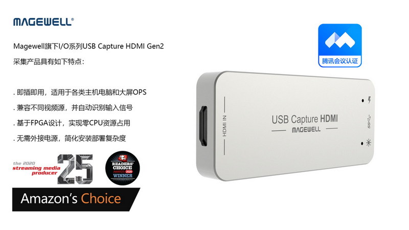 2021年5月12日,美樂威(Magewell)旗下I/O系列USB Capture HDMI Gen2采集產(chǎn)品通過騰訊會議官方認證。