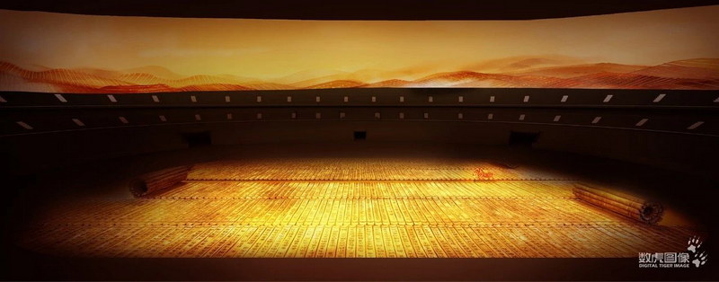 “赫赫始祖,吾華肇造,胄衍祀綿,岳峨河浩 ,聰明睿知,光被遐荒,建此偉業(yè),雄立東方”,《黃帝頌》天籟之音回蕩在開(kāi)幕式會(huì)場(chǎng),全場(chǎng)黃色竹簡(jiǎn)顯現(xiàn),大氣磅礴。古老的文字在竹簡(jiǎn)上活靈活現(xiàn),從地面連接到線幕,形成地面與空中的呼應(yīng),帶來(lái)整體的視覺(jué)聯(lián)動(dòng)。文字似麥浪在舞臺(tái)上翻滾升騰,借著竹簡(jiǎn)連接古今,抒發(fā)對(duì)始祖軒轅黃帝的高山仰止之情。
