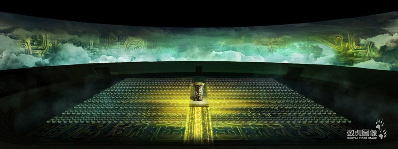金色的大道,整齊劃一的周朝禮服表演,地面上投影的青銅器紋路,在燈光中斑駁陸離,凸顯了青銅器作為文物的神秘以及藝術(shù)魅力。線幕中間更有收藏于中國(guó)寶雞青銅器博物院的青銅器何尊在不停的轉(zhuǎn)動(dòng)。作為國(guó)家一級(jí)文物,其1963年出土于陜西省寶雞市寶雞縣賈村鎮(zhèn)(今寶雞市陳倉(cāng)區(qū)),尊內(nèi)底鑄有銘文12行、122字銘文,“宅茲中國(guó)”為“中國(guó)”一詞最早的文字記載。它的出現(xiàn)無(wú)形中讓中國(guó)文化、陜西文化在舞臺(tái)上交相輝映。作為中國(guó)文化的一部分,陜西文化無(wú)疑是一顆璀璨的明珠。