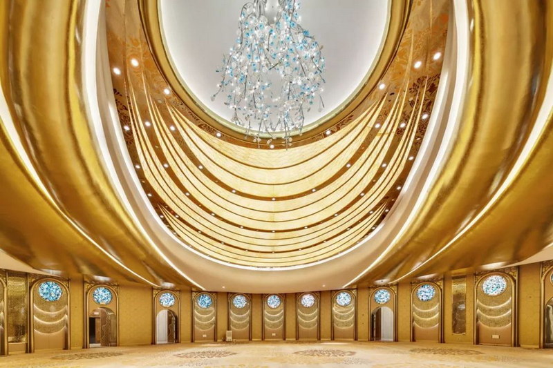 酒店宴會廳大堂的設計追求整體統一,以弧形線條來構造這個空間,設計師別出心裁的使用現代簡潔的設計手法來體現豪華的空間感受。而圓形宴會廳的平面則呈現一個橢圓形,寓意圓滿。整個宴會廳面積1700平米,能容納1200人的豪華宴會,墻面采用陣列的設計手法,使整體空間和諧統一。瑪瑙石的運用彰顯了墻面空間的豪華感,天花設計的靈感源于欲振翅高飛的蝴蝶,整體表現效果美輪美奐。