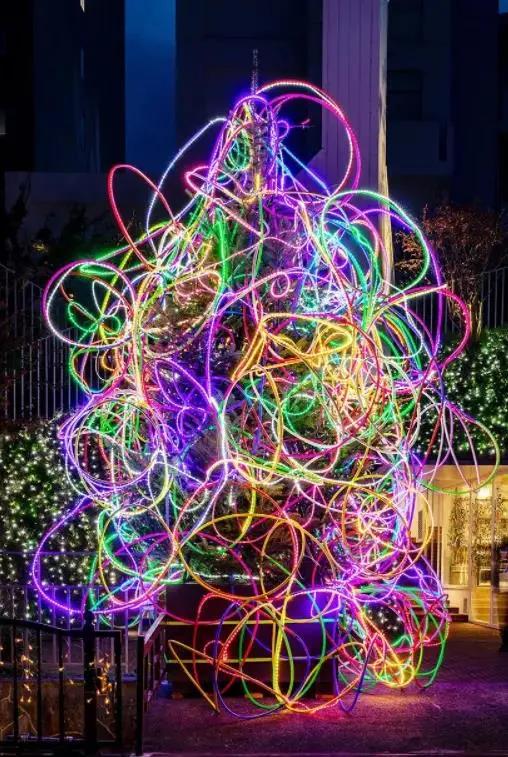 為慶祝日本建筑師藤本壯介設計的白屋酒店開業一周年,藝術家kengo kito大膽使用 2,500 個不同顏色的呼啦圈創作了一個公共藝術雕塑,裝飾了外面四米高的圣誕樹。