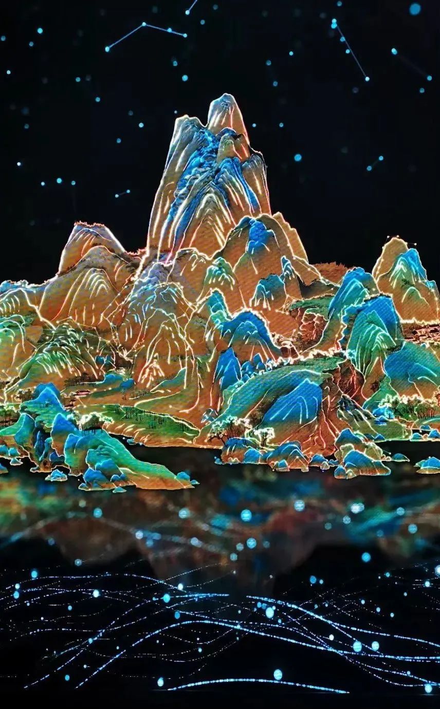 通過傳統(tǒng)藝術(shù)的數(shù)字活化將江山圖各部分動(dòng)態(tài)化數(shù)字化,分別以古人與今人的視角對(duì)作品重新審視與建構(gòu)。以大觀小、曠觀、神游、浸入式的視覺體驗(yàn)、散點(diǎn)透視與焦點(diǎn)透視的自由切換,讓觀眾在現(xiàn)代與傳統(tǒng)、科技與藝術(shù)之間來回穿梭,在形式上通過光學(xué)鏡面反射的原理,將空間向外延展,從而形成一個(gè)無限延伸的廣闊空間,讓觀眾仿佛置身于千里江山之中,感受壯麗山河中所傳達(dá)出自信與氣勢(shì)。