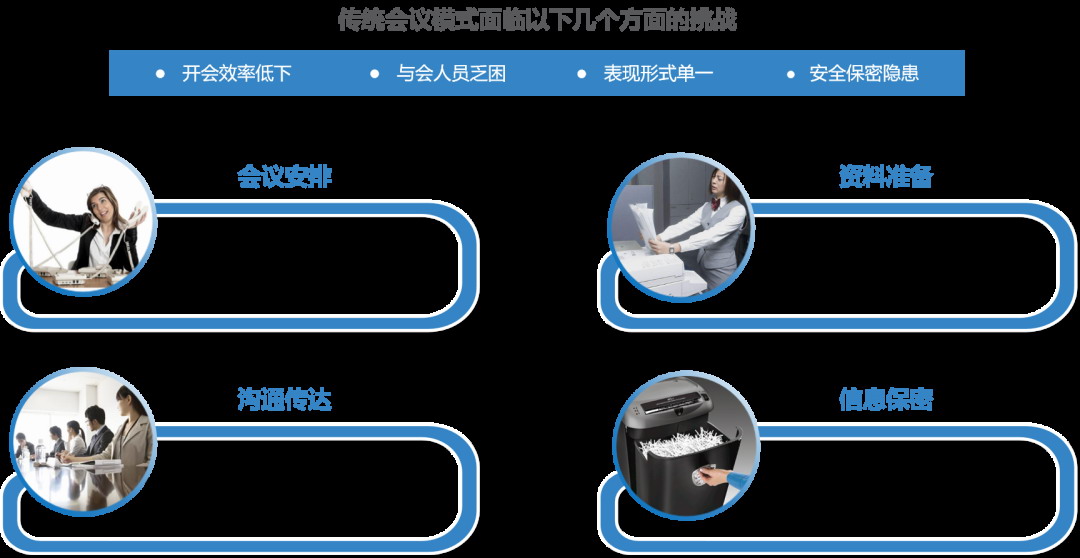 每次開會,工作量大且缺乏應變能力,會場排位手工管理、機動性差、效率低。與會人員交互時需要操作多套設備(音頻、視頻、文件操作等),增加系統使用難度。與會人員桌面布局復雜,物品繁多凌亂。會議中資料修改情況難以記錄,討論過程無法保存。與會人員與服務人員間溝通不暢。會后文件管理造成巨大的紙張浪費,紙質材料可能導致泄密,安全無法保障,對高端機密會議造成嚴重威脅,可能導致重大損失。