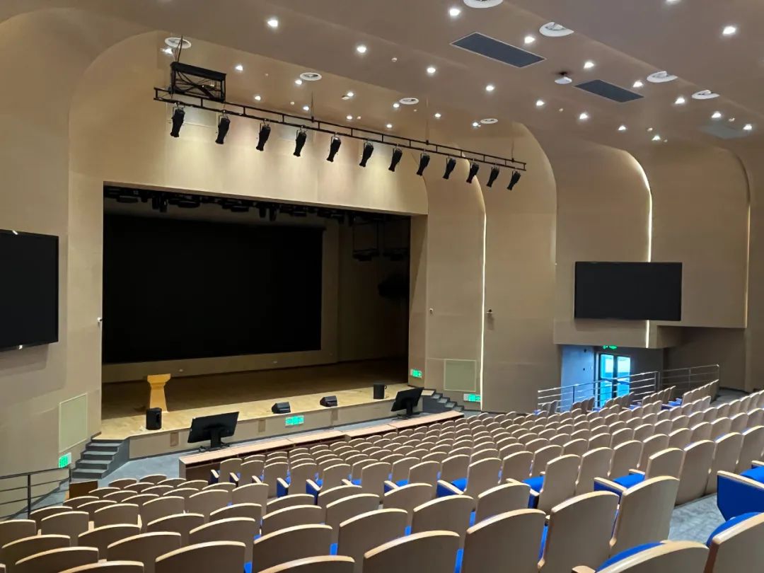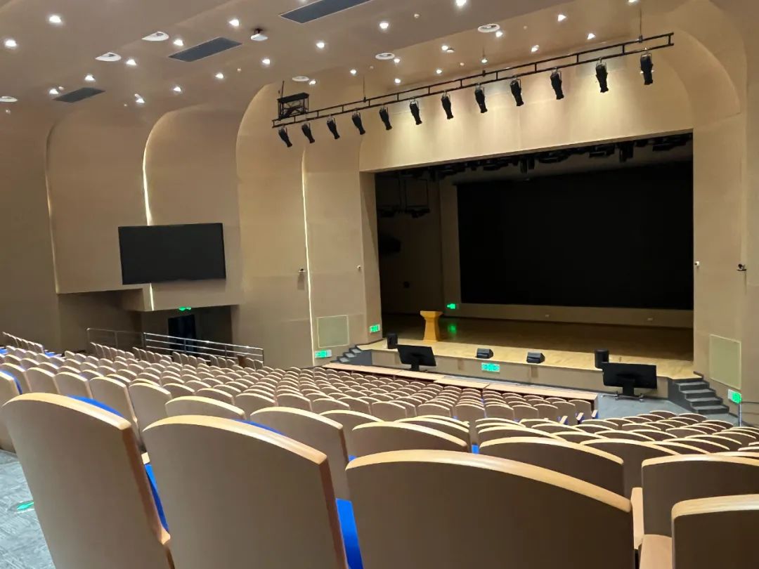 音箱的安裝位置和聲輻射方向,保證了觀眾席中各處有合適的響度、均勻度、清晰度和豐滿度,在觀眾和講臺的后墻,適當吸聲處理,減少后部反射聲,天花和側墻則作為反射面處理,用配置擴散結構進行聲折射和擴散,以增強早期反射聲,提高語言清晰度、使聲場分布均勻,同時利用天花頂和側墻后的空間設置低頻吸聲結構,減少低頻混響時間。