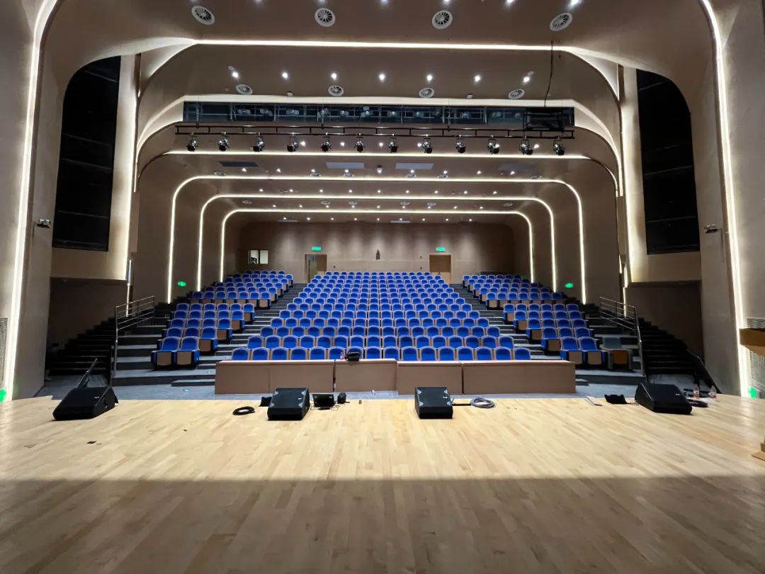舞臺左右各2只15寸全頻音箱FR-X15aHQ增強了聲音的空間立體感,提供全場主擴聲。舞臺中央吊掛暗裝于臺口上聲橋內(nèi),中置共2只12寸全頻音箱FR-X12aHQ,彌補了左右主擴音箱投射方向的不足,使全場聲壓級分布均勻。