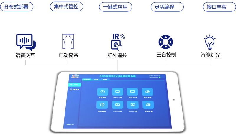 節點自帶IR/IO/RS232可編程中控接口,可對周邊環境設備進行集中控制。