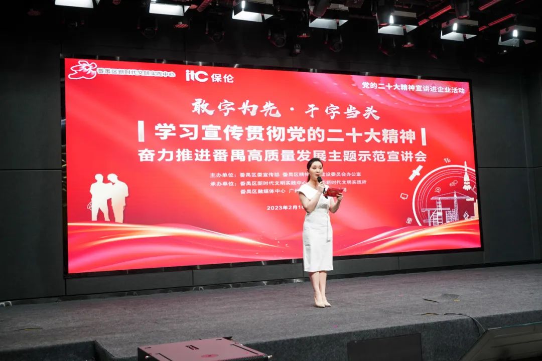2月16日下午,由番禺區委宣傳部、區文明辦主辦,番禺區新時代文明實踐中心、東環街新時代文明實踐所、番禺區融媒體中心、廣州市保倫電子有限公司承辦的“敢字為先 干字當頭——學習宣傳貫徹黨的二十大精神 奮力推進番禺高質量發展”主題示范宣講會在保倫電子itc召開。廣州市委講師團副團長區肇君,番禺區委宣傳部副部長、區文明辦主任張青,廣州市保倫電子有限公司副總裁阮勝林,相關職能部門、鎮街分管領導、宣傳辦主任,區基層理論宣講團代表以及保倫電子員工代表共同參加活動。