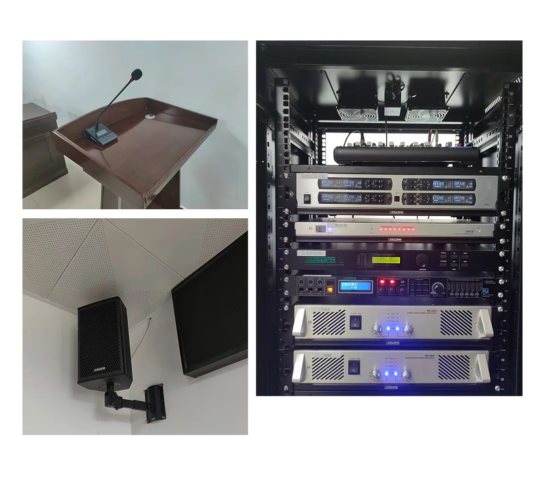 人民政府會議室擴聲系統由無線臺式話筒、專業調音臺、時序器、反饋抑制器、數字音頻處理器、立體功放、壁掛音箱組成。專業的二分頻音箱作為會議主擴聲設備,根據會場大小與布局,靈活調節指向角度,精準覆蓋,保障聲場均勻,會議擴聲音質清晰飽滿。