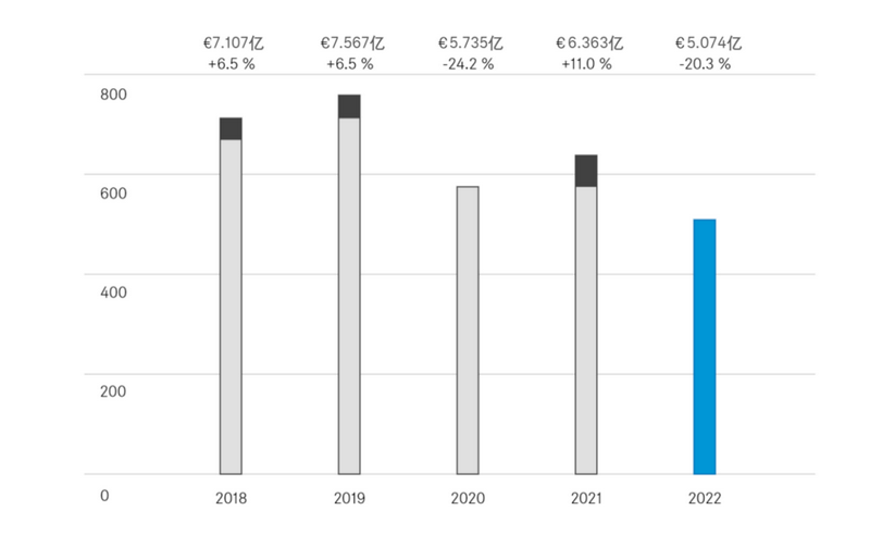 2022年,森海塞爾集團總營業額為5.074億歐元。其中,專業音頻解決方案業務部分,營業額達到 4.677 億歐元, 2021 年消費品業務也包含在銷售額中,約占總銷售額的一半,2022 年財報中仍包括其兩個月的銷售額。由于消費品業務的變動,銷售額下降20.3%。