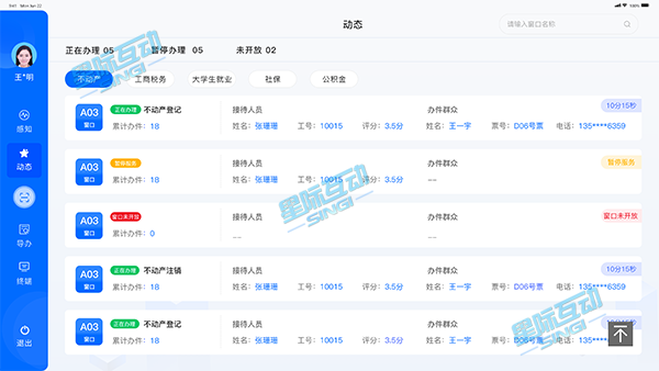 智慧政務“數字工位"板塊能夠實時、動態、全方位、多角度的監控到每一個窗口的服務質量、服務效率、服務方式等,并可回放整個辦件過程。政務服務大廳的多樣化數字智能操作模式,不僅對窗口工作人員的行為、態度、著裝規范進行監督,使績效考核有理有據,同時也是保護窗口工作人員的一種有效手段。