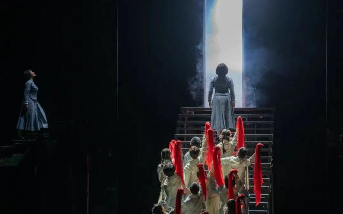 例如23年國家大劇院上演的歌劇《青春之歌》,以“青春”與“革命”為主線,人生岔路中面臨多次的抉擇,林道靜走向階梯盡頭,45度傾斜的鏡面屏幕,展現了女主三種不同視角的形象:渴望自由、積極革命以及對國家美好未來的期許。象征著生命價值的重選,體現了她的心胸、格局、境界,更體現了不同的意義理解、價值的選擇、責任的擔當。與“熱血青年對理想追求”的主題所期望的情感表達完美契合,演員與影像的配合為整體戲劇創作提供情感上的情境合一,以影像裝置與舞美設計結合方式完成對戲劇藝術的磨礪與錘煉,使思辨意義更加深入人心。