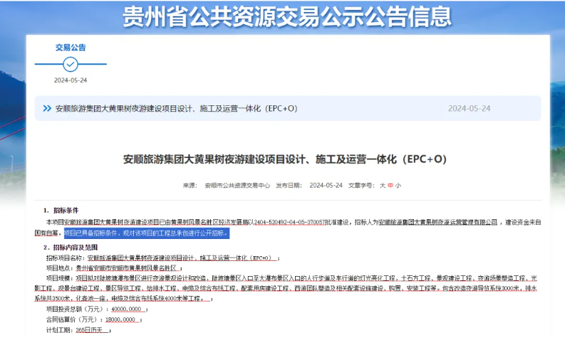 5月24日,貴州省公共資源交易網(wǎng)發(fā)布安順旅游集團(tuán)大黃果樹(shù)夜游建設(shè)項(xiàng)目設(shè)計(jì)、施工及運(yùn)營(yíng)一體化(EPC+O)招標(biāo)公告。項(xiàng)目投資總額40000萬(wàn)元,其中,本項(xiàng)目合同估算價(jià)為18000萬(wàn)元。