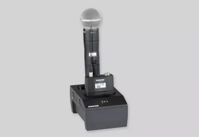 Shure ULX-D™發(fā)射機裝備鋰電池進入SBC200充電器中充電,充電過程中自動射頻信號啞音