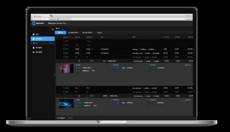 完全免費使用的KiloLink Server Pro不僅可以作為推流的載體,更能將設備集中管理、批量升級等功能全面整合。現在,您可以通過WEB端輕松完成無上限設備管理、狀態查看及監測、無限路數一鍵推流,使復雜的流媒體管理工作變得簡單高效。而在日常的工作流中,也無需額外購買語音通話系統、專用解碼器等設備。您可通過KiloLink Server Pro及Kis Pro完成語音通話/指揮系統的搭建,而通過任意型號解碼器(如千視D350)即可完成解碼工作。這意味著您可以用最低成本的方式高效完成現有工作流的升級。