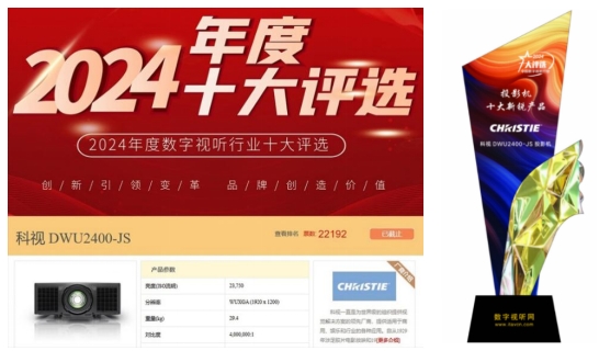 在數字視聽網的“2024年度十大評選”中,科視Christie也表現出色。全新Jazz系列DWU2400-JS 1DLP激光投影機憑借先進的電子技術和震撼的視覺效果,榮獲“十大新銳投影機產品”殊榮。這一獎項充分體現了科視在創新、性能和市場適應性方面的出眾表現。